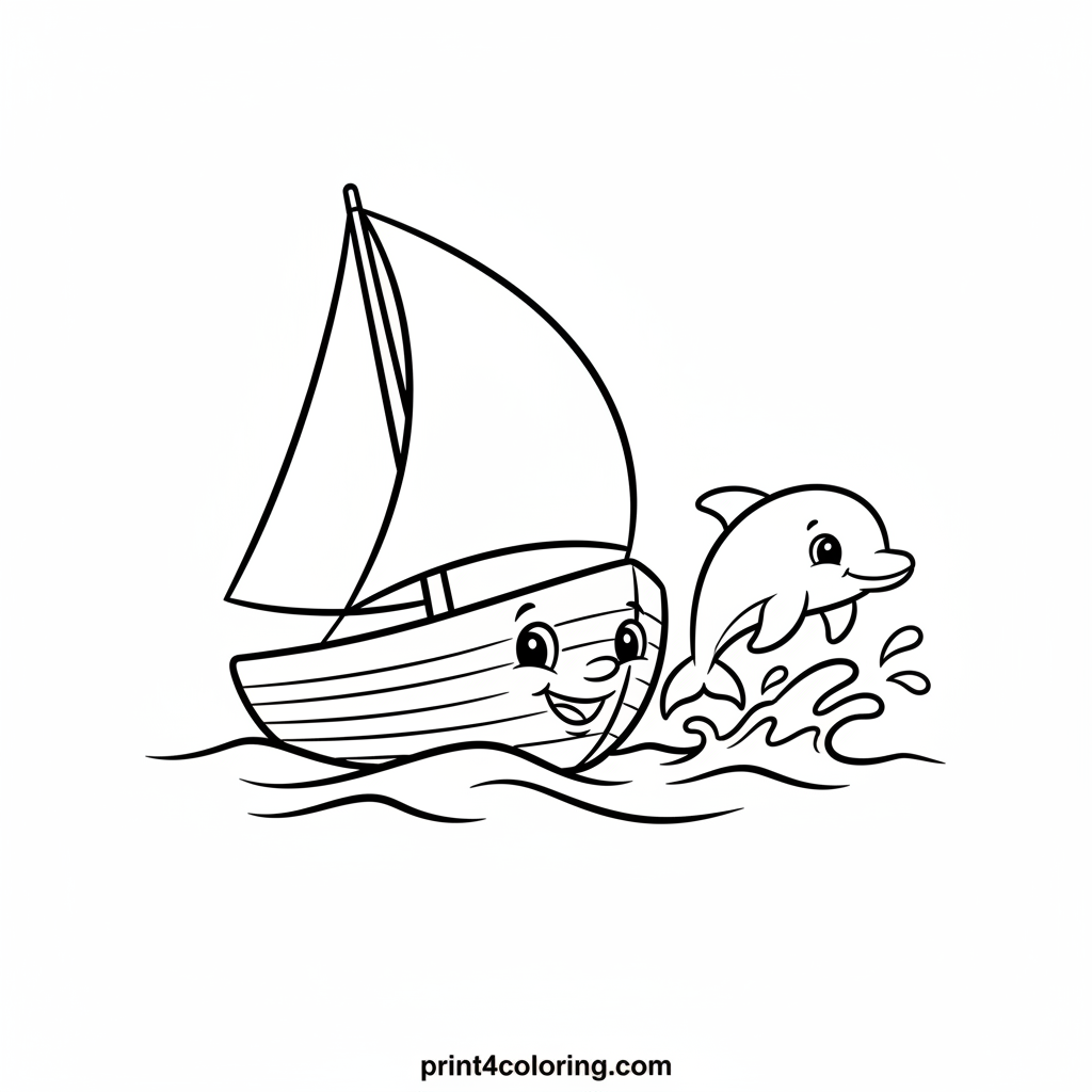 Join a cute, speedy sailboat as it zips across the sparkling blue ocean! Its big, billowing sail catches the wind, propelling it forward. A joyful dolphin leaps right beside it, creating a playful splash. Get ready to color this exciting marine adventure and bring the ocean to life with your favorite hues!