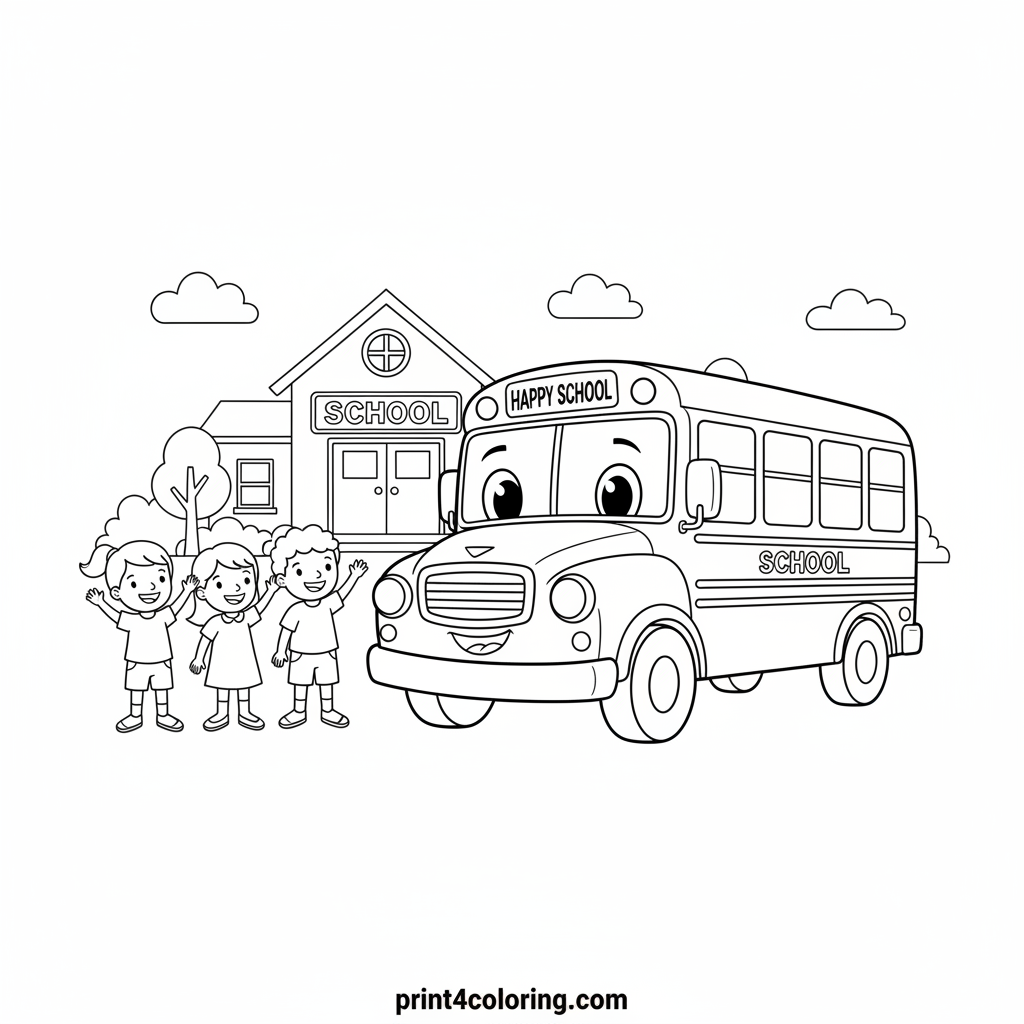 Get ready for a joyful ride with our friendly school bus! This cheerful bus, with its big smile and kind eyes, is parked happily in front of the school, waiting for you. A few happy kids are waving goodbye, excited for their day. Grab your crayons and bring this bustling school scene to life with your favorite colors!