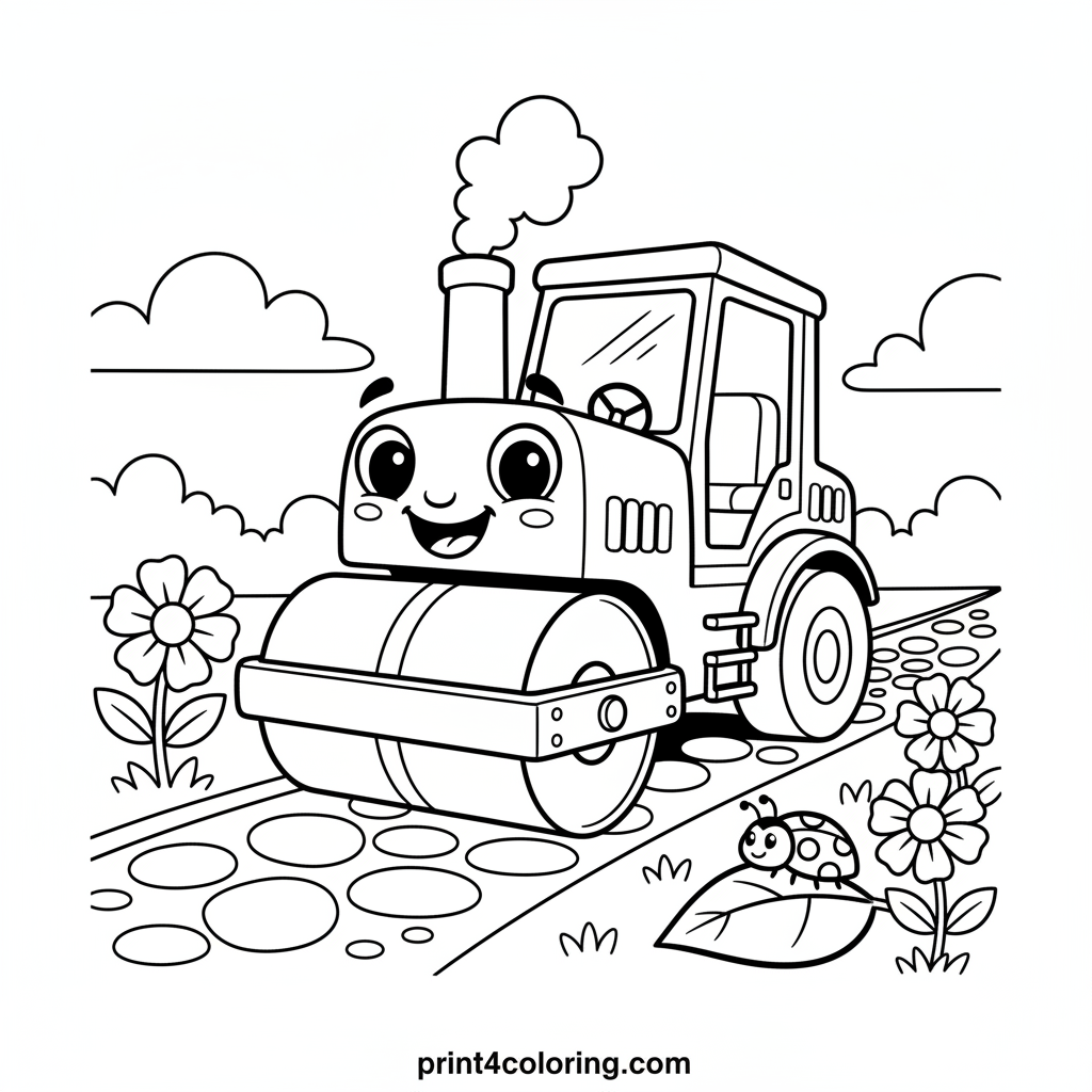 Join our friendly steamroller with big, happy eyes as it carefully paves a winding garden path. Look closely for the simple, lovely flowers blooming all around and a tiny ladybug watching the work. This cheerful scene is perfect for little artists to bring to life with their favorite colors!
