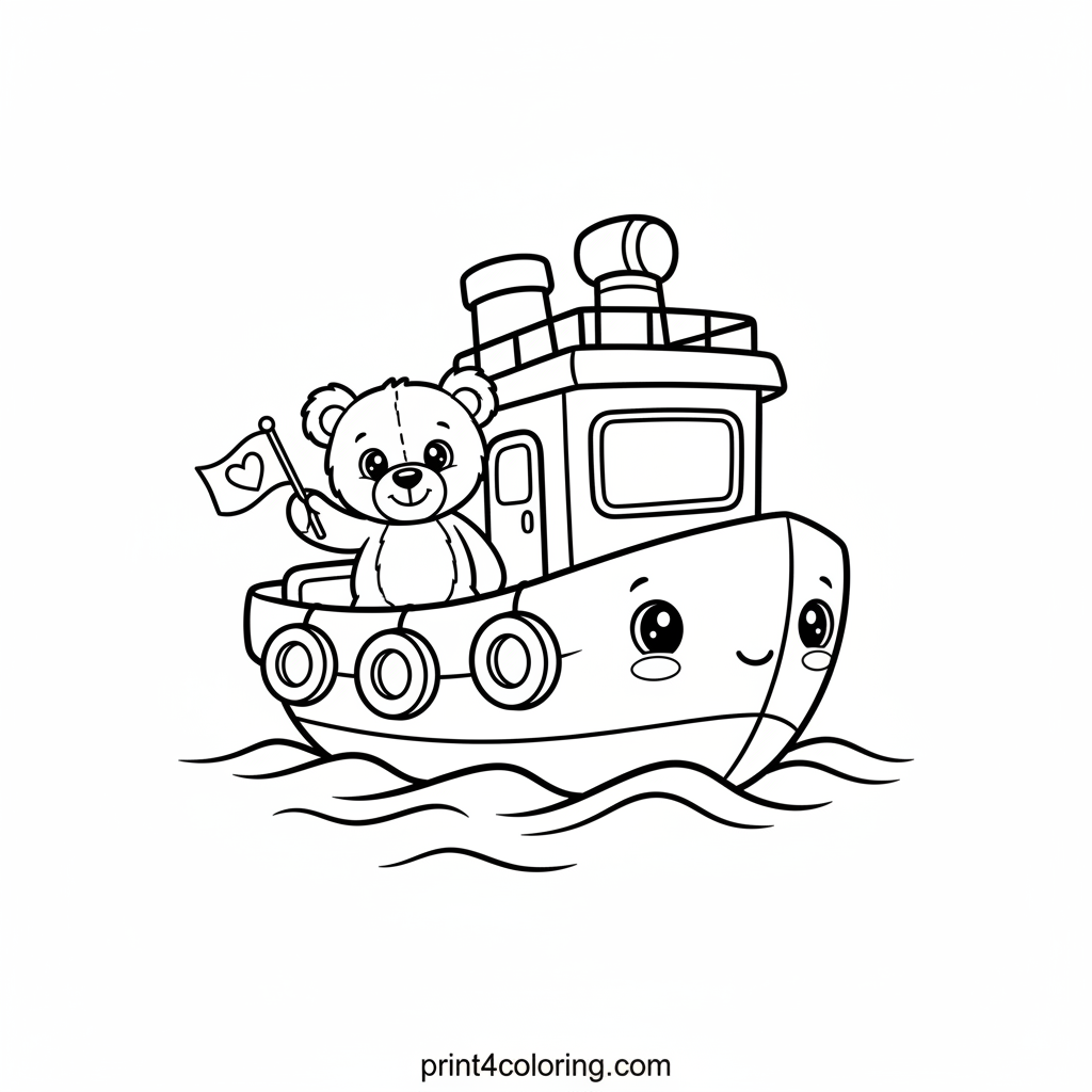 Join our happy little tugboat with big, friendly eyes as he gently chugs across the calm, wavy water. A cheerful teddy bear sits on deck, waving a tiny flag, ready for a cozy adventure. This delightful scene is perfect for young artists to bring to life with their favorite colors, creating a peaceful journey.
