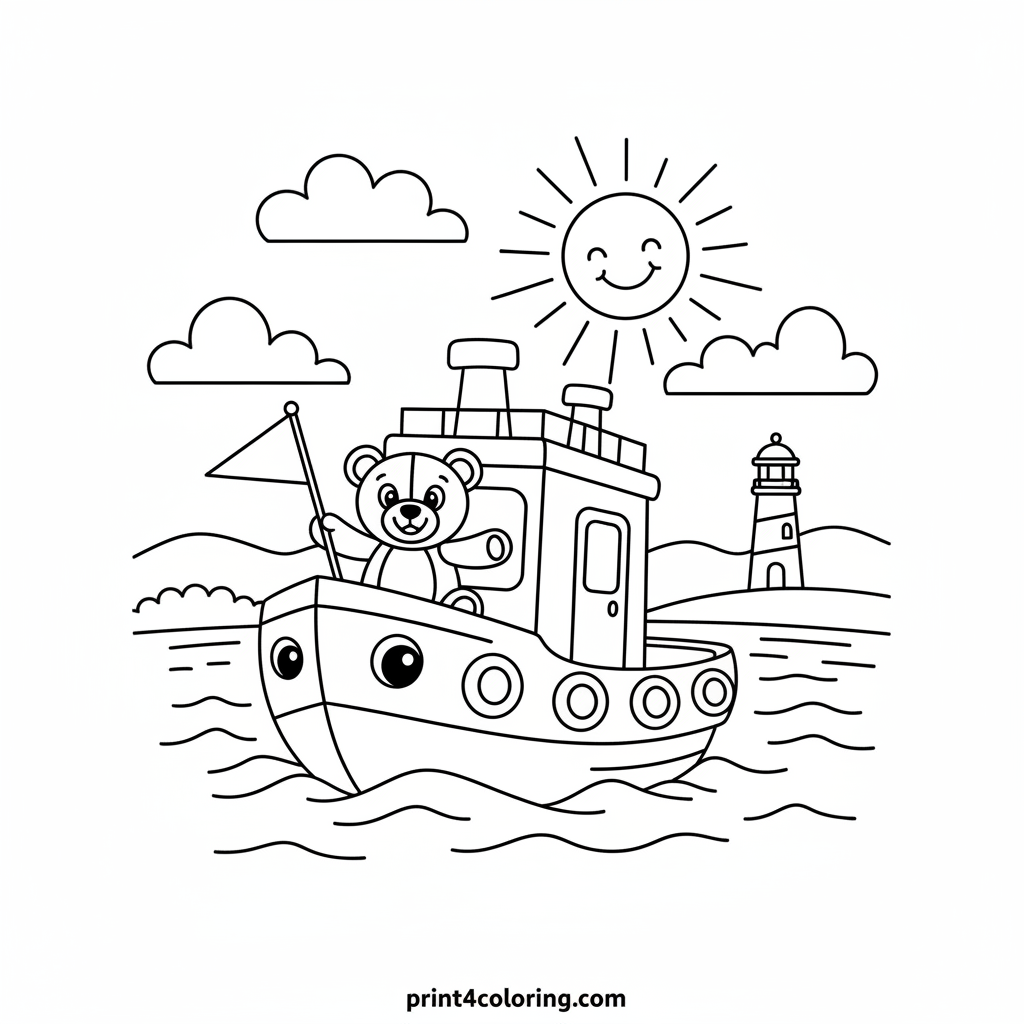 Join our happy little tugboat on a delightful journey! With big, friendly eyes, it chugs gently across calm, wavy waters. A cheerful teddy bear waves a tiny flag from the deck, adding to the fun. This scene is perfect for young artists to bring to life with bright, happy colors. Let your imagination set sail!