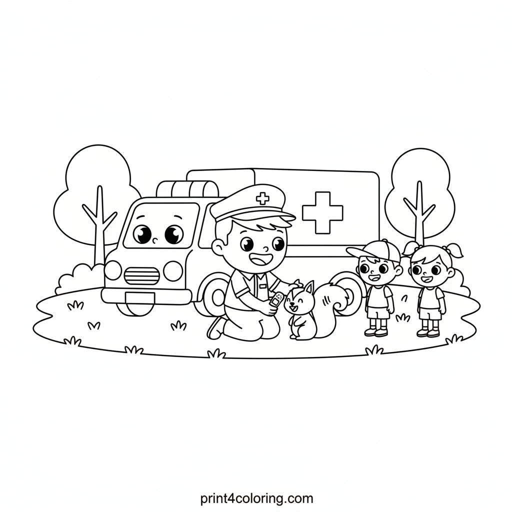 Discover a heartwarming scene in a sunny park! A kind paramedic from a bright ambulance is gently helping a happy squirrel with a tiny scratch on its tail, offering a colorful bandage. Children watch with interest, learning about kindness and community helpers. A perfect page to color with cheerful shades!