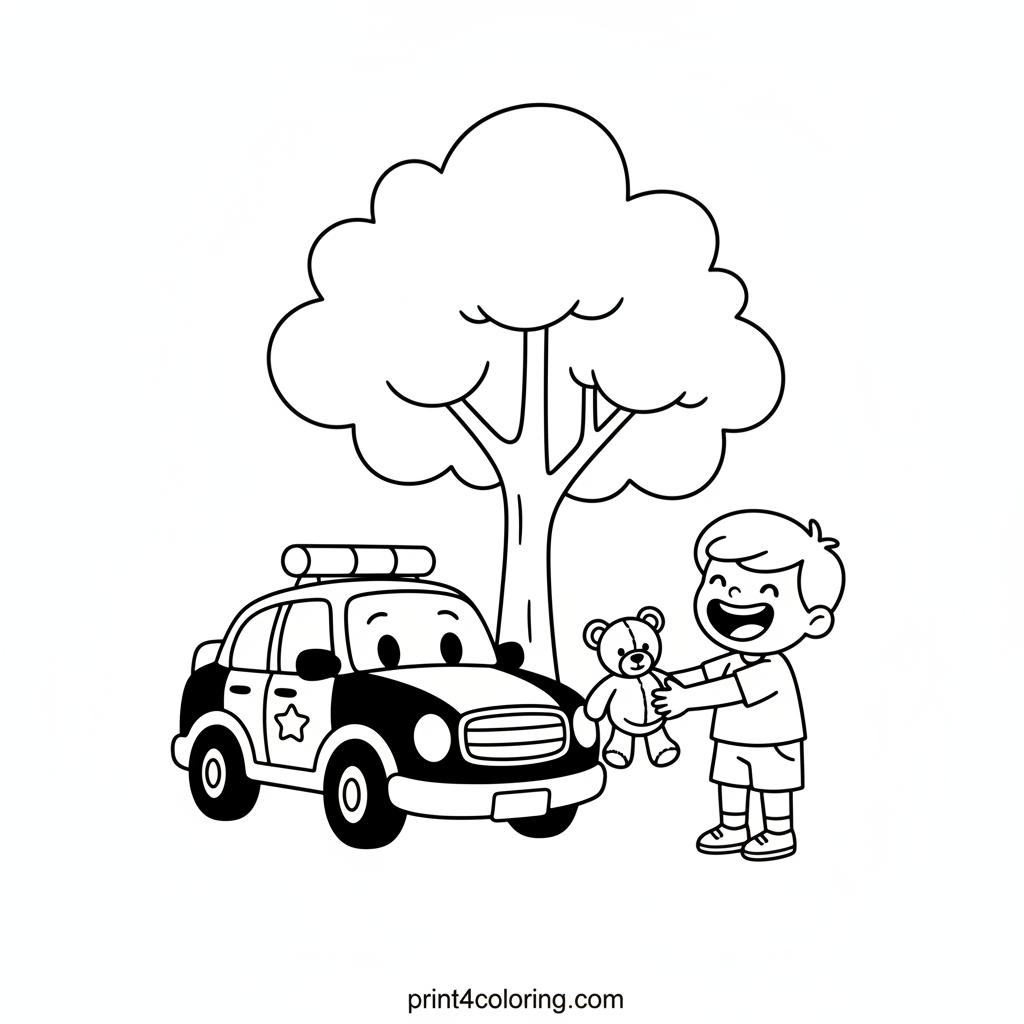 Join a friendly police car on a heartwarming mission! This brave vehicle is helping a lost teddy bear reunite with its giggling owner, all under the shade of a tall, leafy tree. A scene full of kindness and happy reunions, just waiting for your colors. Bring this sweet story to life!