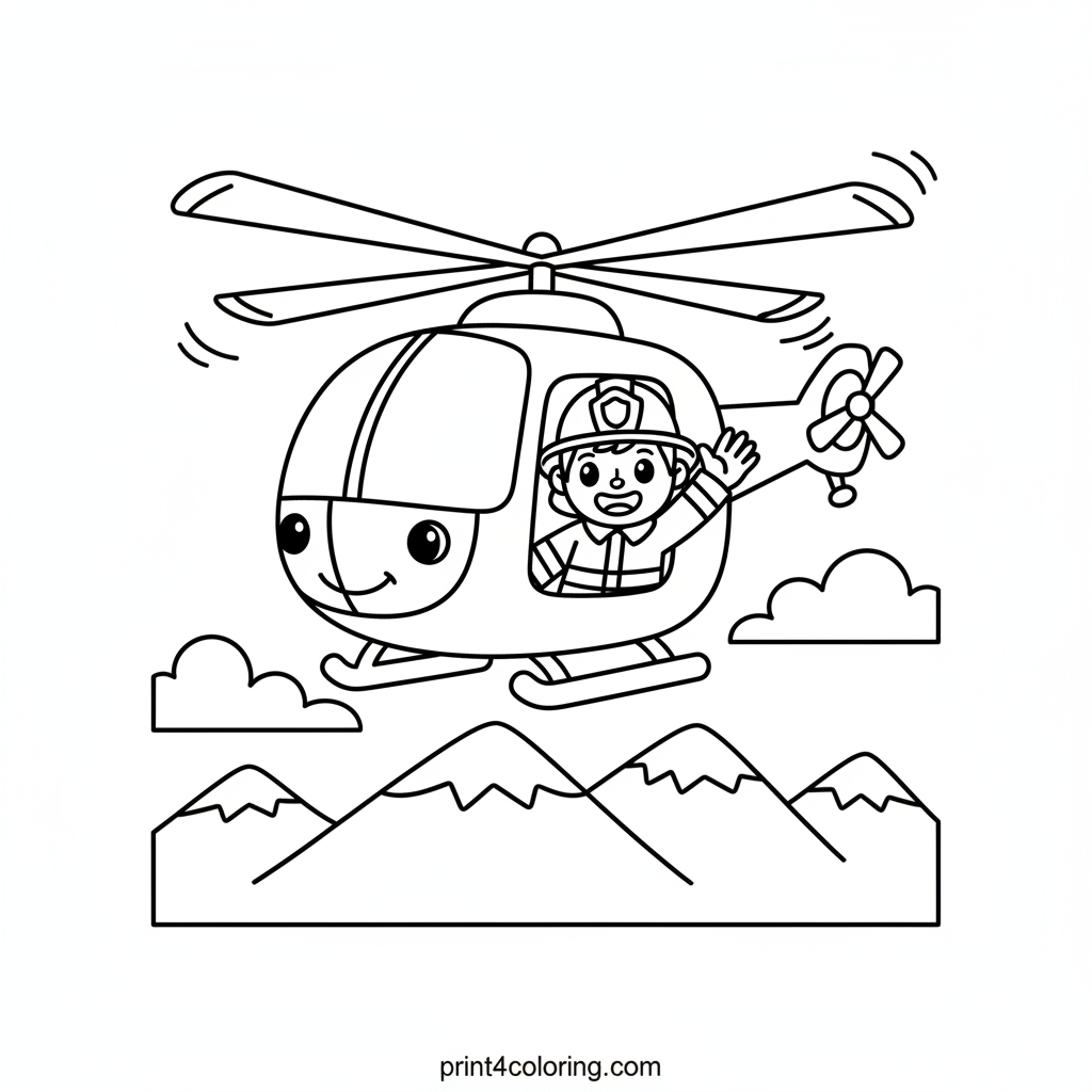 Get ready for action! This coloring page shows a strong rescue helicopter zooming through the sky, its powerful rotor blades spinning fast. A brave firefighter waves from the open door, ready to help anyone in need. Imagine the exciting adventures they're on as you bring this heroic scene to life with your favorite colors!