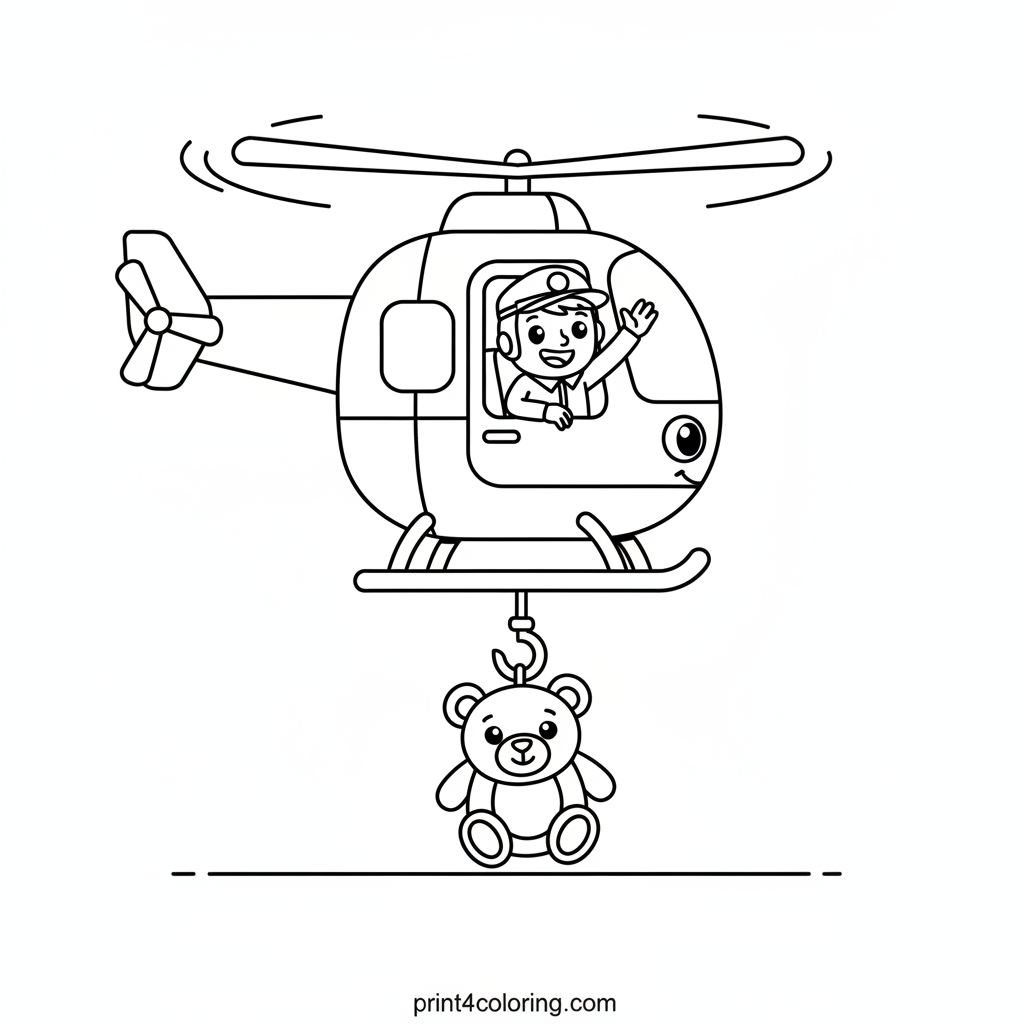 Get ready for a thrilling coloring adventure! A brave rescue helicopter hovers gently, its friendly pilot waving hello. Look closely as a happy teddy bear is carefully lifted to safety by the helicopter's strong winch. Imagine the exciting mission and bring this heroic scene to life with your favorite colors!