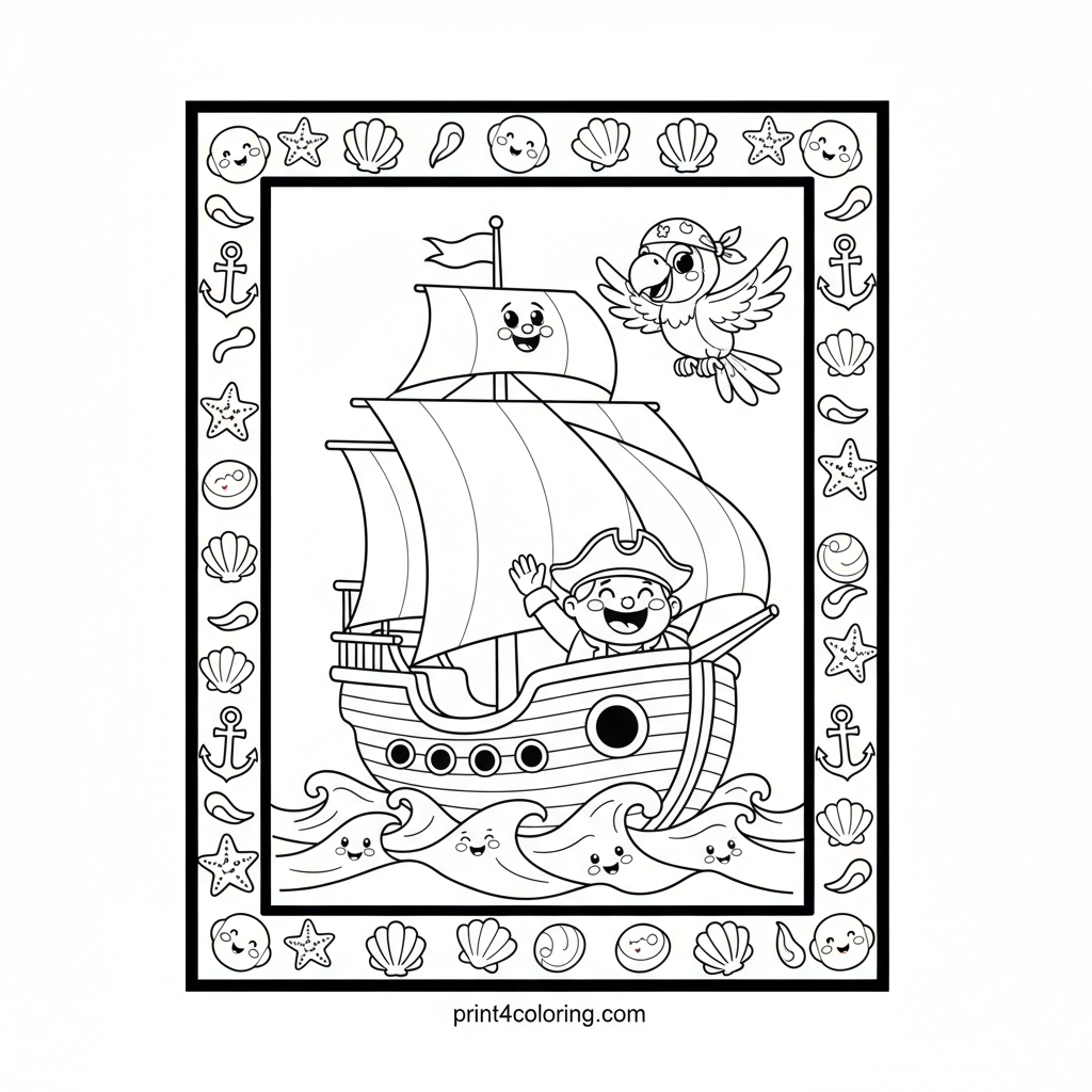 Set sail on a grand adventure with our happy pirate ship! Watch its big, billowy sails catch the wind as it speeds across the ocean waves. A friendly pirate captain with a big smile waves from the deck, and a jolly parrot soars overhead. Grab your crayons and bring this exciting sea journey to life!