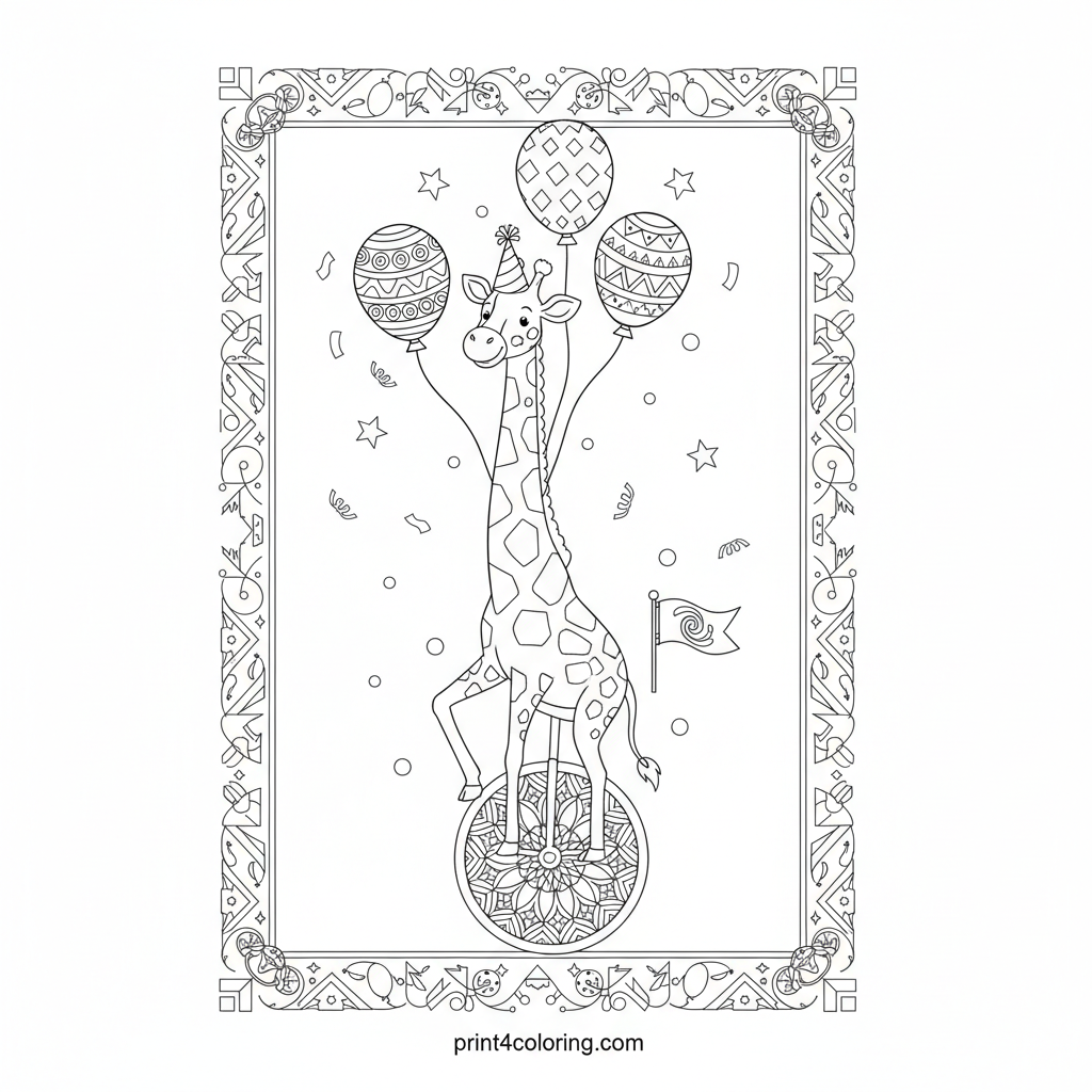 Join a magnificent giraffe as it pedals through a spectacular parade on its giant unicycle! Watch it cleverly juggle colorful geometric balloons with its long neck while festive confetti rains down. This scene is bursting with patterns and joy, perfect for a challenging and fun coloring adventure.