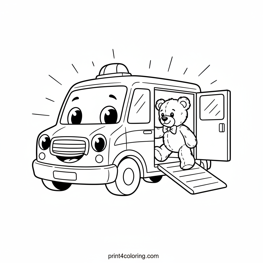 Meet our friendly ambulance with its big, kind eyes, gently helping a fluffy teddy bear get safely into its back. A soft, welcoming glow surrounds this heartwarming scene, ready to bring comfort and care. This coloring page celebrates kindness and the importance of helping friends in need, making everyone feel safe and loved.