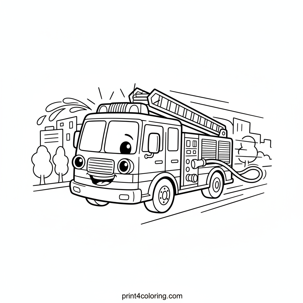 Join the brave fire truck on an exciting rescue mission! This dynamic page shows a friendly fire truck speeding with flashing lights and an extended ladder. A gentle stream of water flows from its hose, ready to help. The blurred background adds a fun sense of movement for young artists!