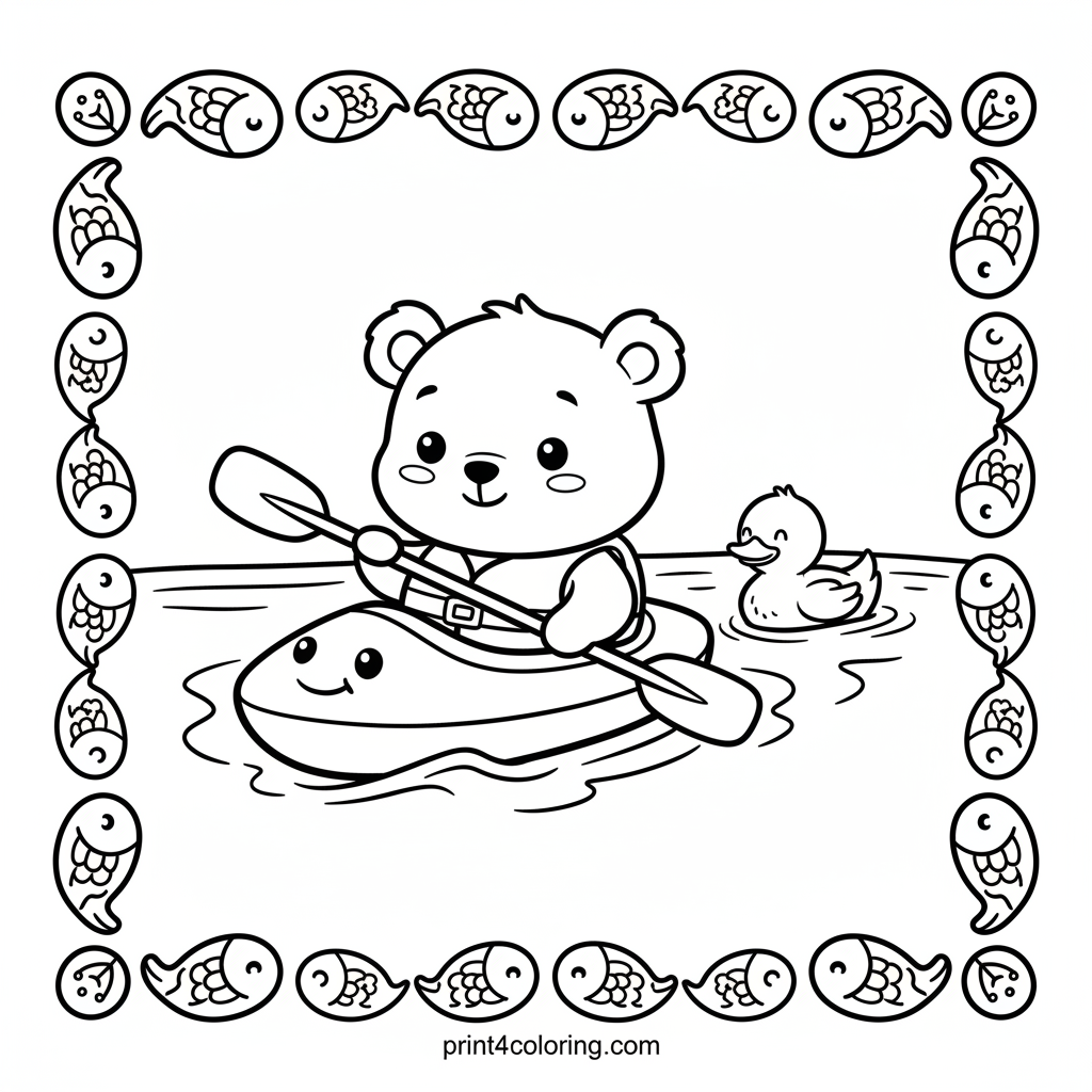 Join a chubby, smiling baby bear on his very first kayak adventure! He's wearing a tiny life vest and gently paddling his bright, friendly boat across a calm, wavy lake. A happy duck swims right alongside, cheering him on. Get ready to add vibrant colors to this adorable water scene!