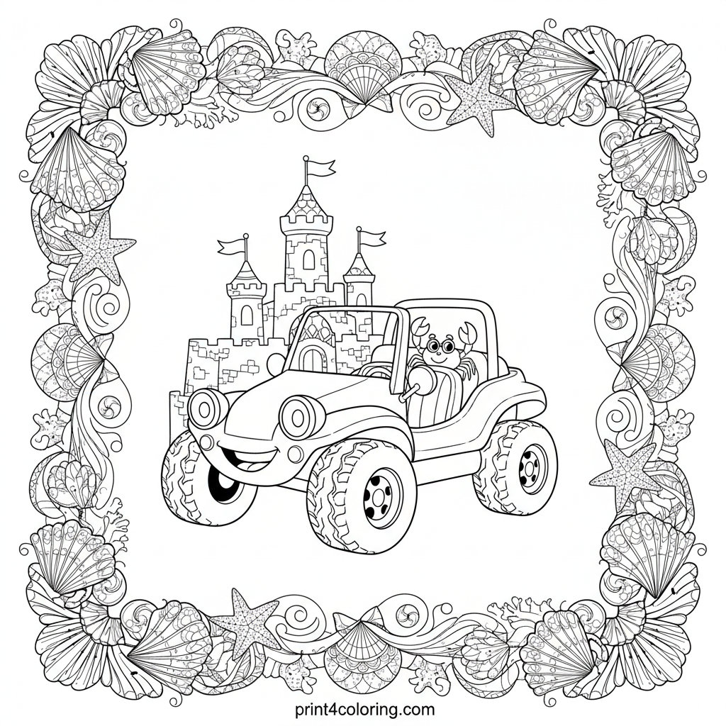 Join a friendly dune buggy with big, smiling headlights on a sunny beach adventure! Explore an intricate sandcastle with tiny flags, surrounded by zentangle-patterned seashells and swirling waves. A cute little crab peeks out from the buggy, adding to this delightful, detailed scene perfect for advanced colorists.