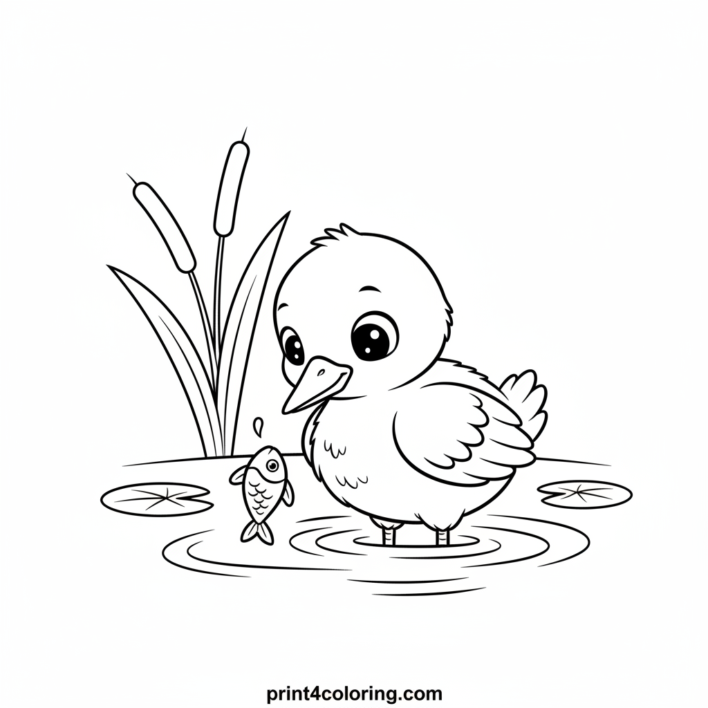 Join a sweet baby crane with big, curious eyes on its very first fishing trip! Standing in shallow water, it's carefully trying to catch a tiny fish. Peaceful reeds and beautiful lily pads fill the background, creating a serene scene for your coloring adventure. What colors will you choose?