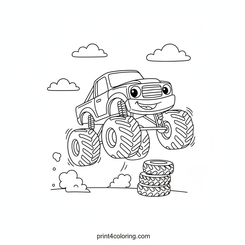 Get ready for a super fun coloring adventure! This adorable monster truck with friendly headlights is having a blast, making a playful jump over a stack of tires. With a happy smile and fluffy clouds in the background, this page is perfect for little artists to bring to life with their favorite colors. Let's make it zoom!