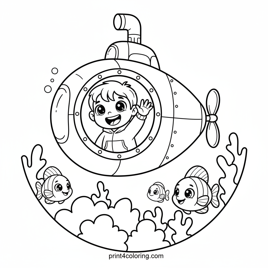 Dive into a wonderful underwater world with our friendly little submarine! A curious child waves from a porthole, surrounded by a bustling coral reef. Watch colorful fish playfully dart among the vibrant corals and sea plants. This cozy scene invites you to explore the ocean's beauty and bring it to life with your favorite colors.
