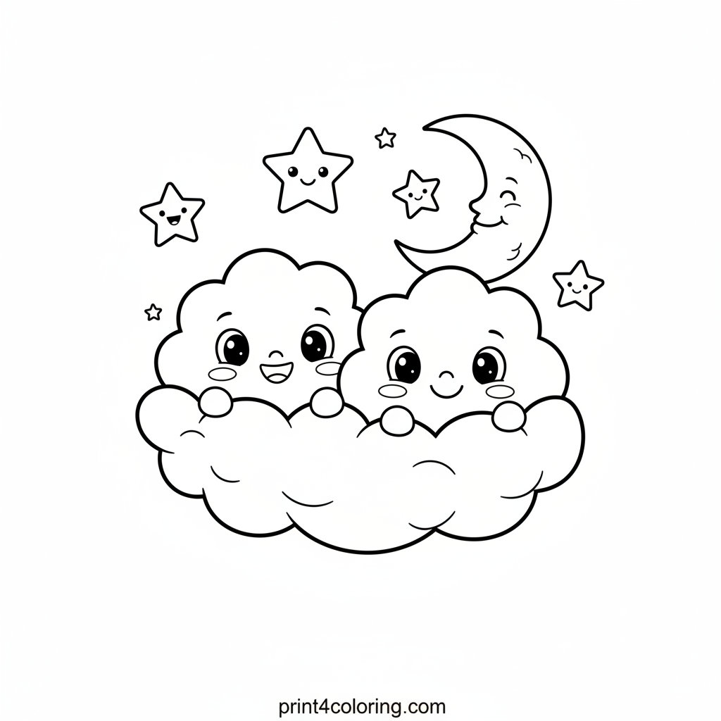 Imagine floating on a soft, fluffy cloud boat through a sky full of sparkling stars and glowing crescent moons! Two happy, smiling cloud friends wave from the side as you sail on this magical journey. Get ready to add your favorite colors to this dreamy scene and bring the whimsical adventure to life!