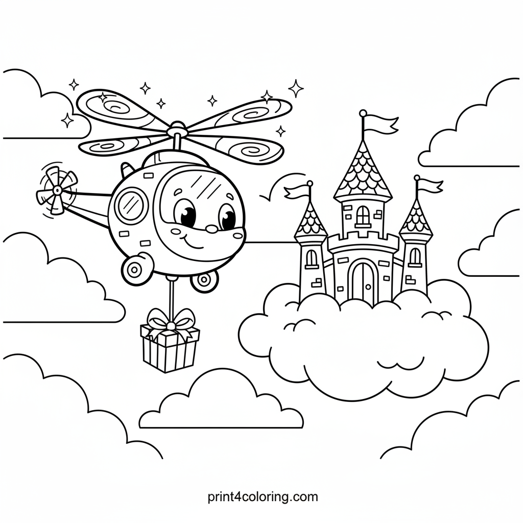 Zoom through a sky bursting with rainbow clouds alongside a sparkling, magical helicopter! This enchanting chopper is on a very important mission, delivering a special package to a whimsical castle floating high above. What wonders could be inside? Get ready to color a scene filled with magic, wonder, and high-flying adventure!