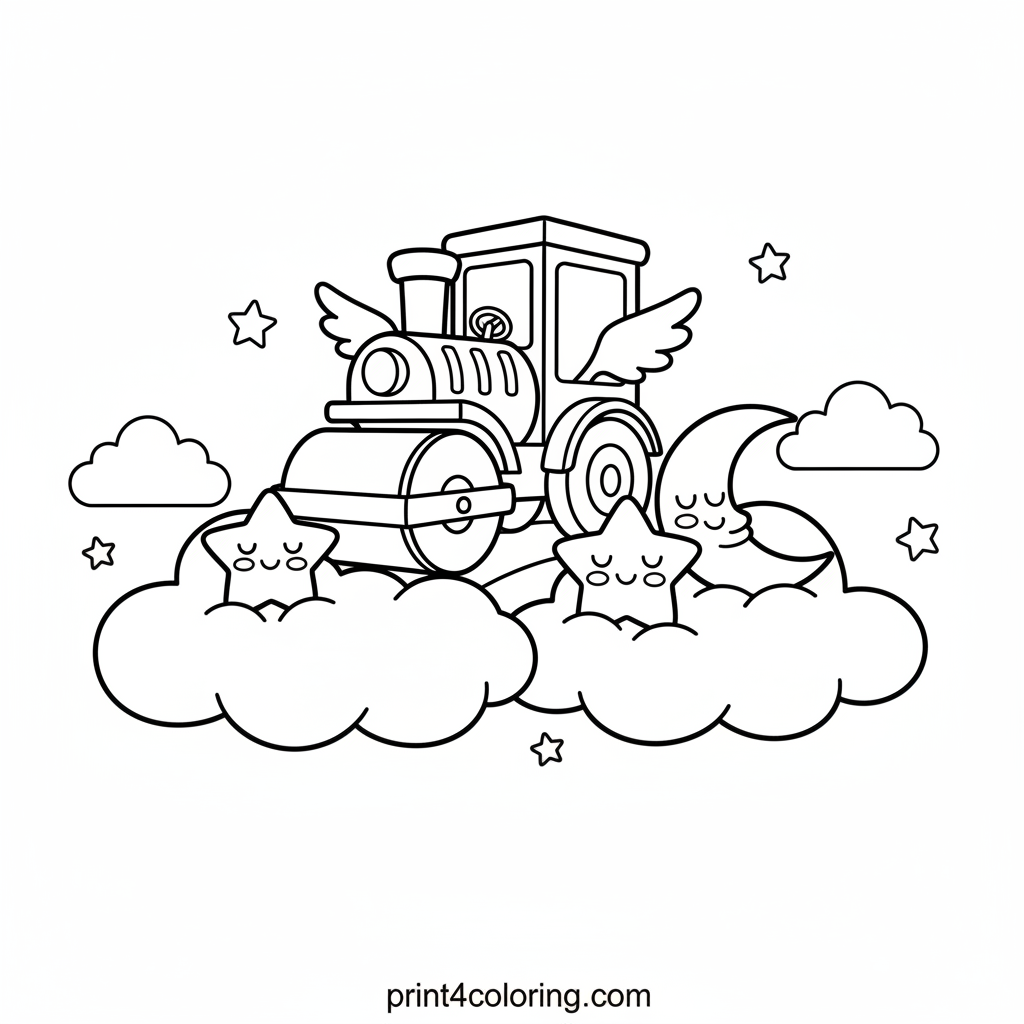 Imagine a world where clouds need to be extra soft! This magical steamroller, with its tiny wings, floats gently through the sky, carefully smoothing out fluffy clouds. Watch sleepy stars and the crescent moon characters enjoy their cozy, newly fluffed beds. Grab your colors and bring this dreamy sky scene to life!