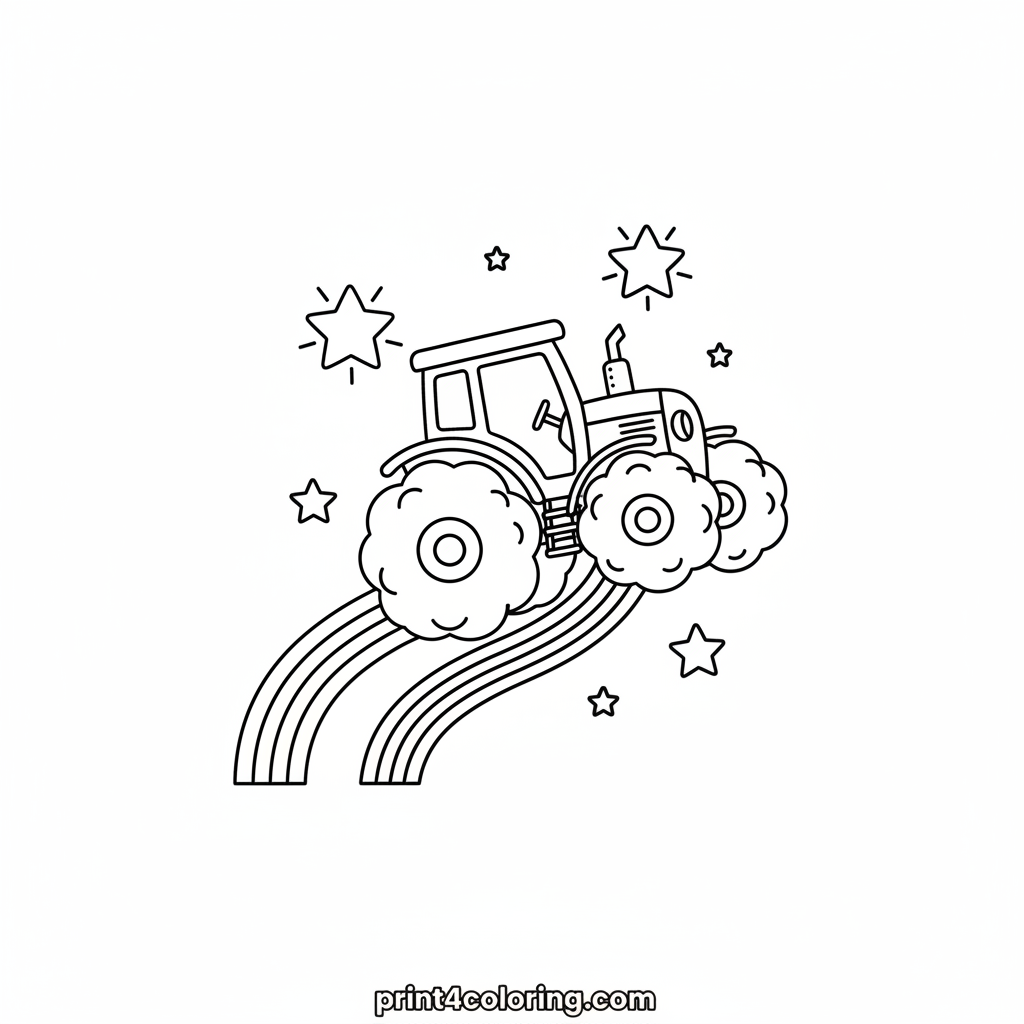 Imagine a wondrous tractor unlike any other! This magical machine has fluffy cloud wheels and floats gently through the night sky. It's surrounded by twinkling stars and leaves a beautiful trail of colorful rainbows wherever it goes. Get ready to bring this dreamy scene to life with your favorite colors and make it sparkle!