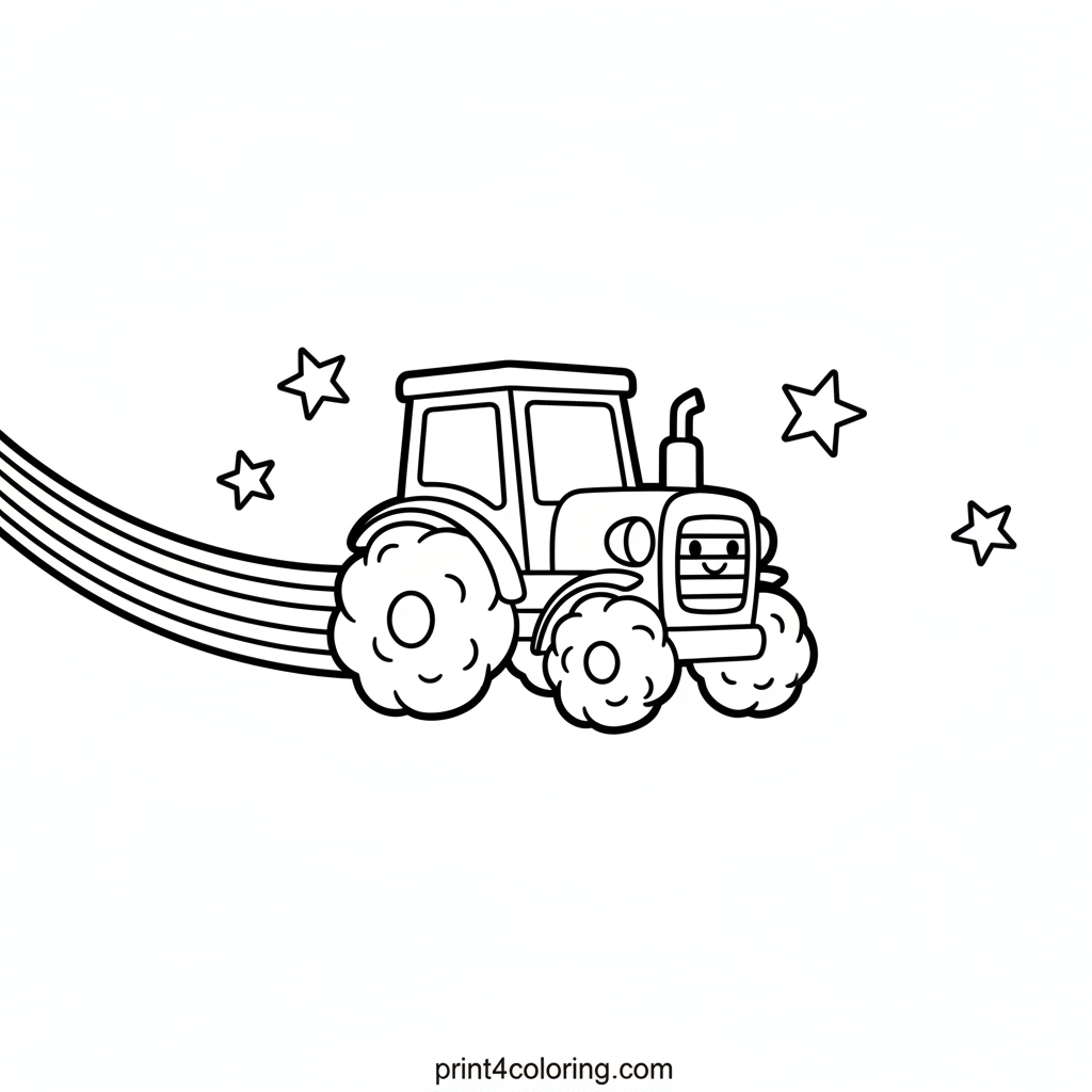 Imagine a wondrous tractor with soft, fluffy cloud wheels! This magical vehicle floats gently across the night sky, passing sparkling stars. As it goes, it leaves a beautiful, colorful trail of rainbows. Get ready to bring this enchanting scene to life with your favorite colors!