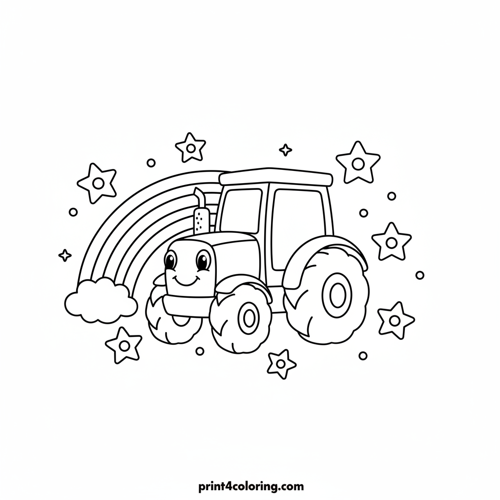 Imagine a super special tractor with soft, fluffy cloud wheels! This magical vehicle gently floats high in the sky, past sparkling stars. As it glides, it leaves a beautiful, colorful rainbow trail behind it. Get ready to color this dreamy scene and bring its magic to life!