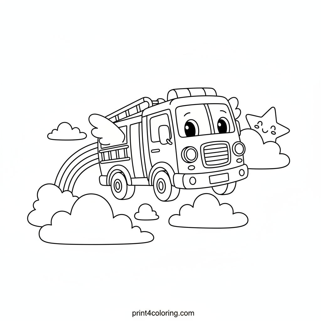 Imagine a brave fire truck, not on the road, but soaring high above the world with tiny, friendly wings! It glides through soft, fluffy clouds, leaving a beautiful rainbow trail behind. A cheerful star winks from behind a cloud, making this a truly magical sky adventure. Get ready to color this wondrous scene!