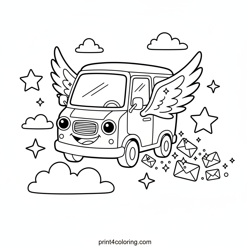 Hop aboard for a magical journey with this whimsical mail van! With sparkling, feathery wings, it soars through a dreamy sky full of soft, puffy clouds and twinkling stars. Watch as it delivers joy, leaving a shimmering trail of glittery mail in its wake. Get ready to add your favorite colors to this enchanting scene!
