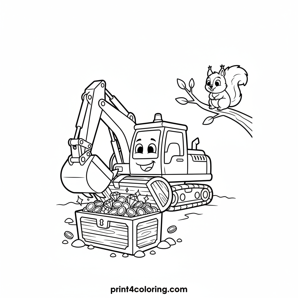 Join a powerful excavator as it unearths a spectacular treasure chest! See sparkling jewels and gold coins spill out, while a curious squirrel peeks from a tree. This exciting scene is packed with adventure, perfect for young explorers who love big machines and hidden riches. Get ready to color a dazzling discovery!