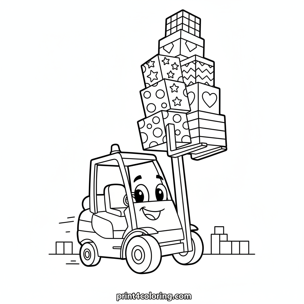Watch this mighty forklift carefully balance a towering stack of colorful, patterned boxes! Its forks are raised high as it navigates a clean floor. Imagine the concentration needed for this stacking challenge. Use your favorite colors to bring this busy scene to life and help the forklift complete its important job!