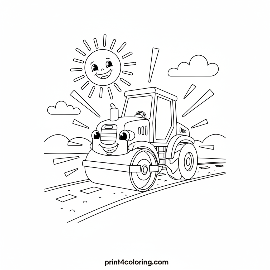 Get ready to color a super strong steamroller as it flattens a brand new road! Watch its giant wheels roll forward with powerful motion under a bright, sunny sky. Imagine the rumble and the smooth new path it creates. A fun construction scene waiting for your creative colors!