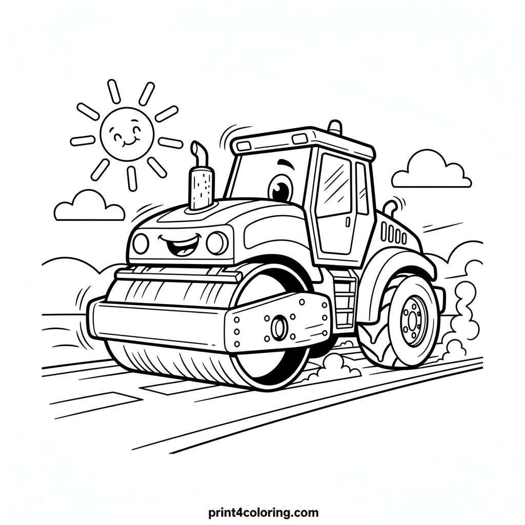 Get ready for some heavy-duty fun! This mighty steamroller powerfully flattens a brand-new road under the bright sun. Bold lines show its incredible strength and forward motion, creating a smooth surface for cars and trucks. Imagine the rumble and the amazing work it does! A fantastic scene for young builders.