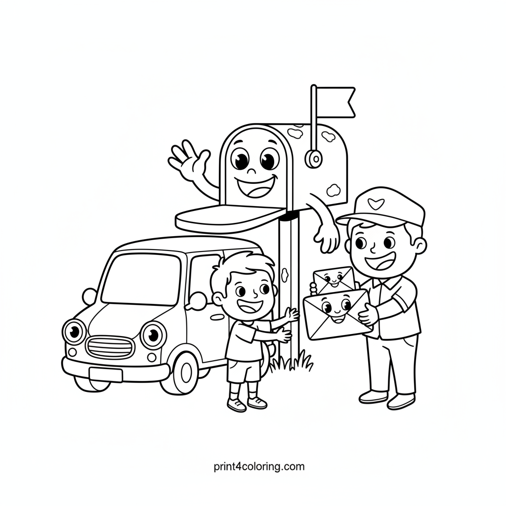 Join the mail carrier on a special delivery! A friendly mail van has arrived at a whimsical monster mailbox. A happy child is eagerly taking a big, smiling letter, while the kind mail carrier holds a stack of cheerful envelopes. Get ready to color this joyful scene of community and connection!