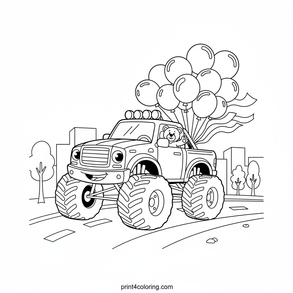 Join the fun as a super cheerful monster truck rolls through a festive parade! Adorned with bright balloons and wavy streamers, this mighty vehicle is ready to celebrate. Look closely, and you'll spot a friendly teddy bear waving hello from the passenger seat, making this parade extra special for everyone watching.