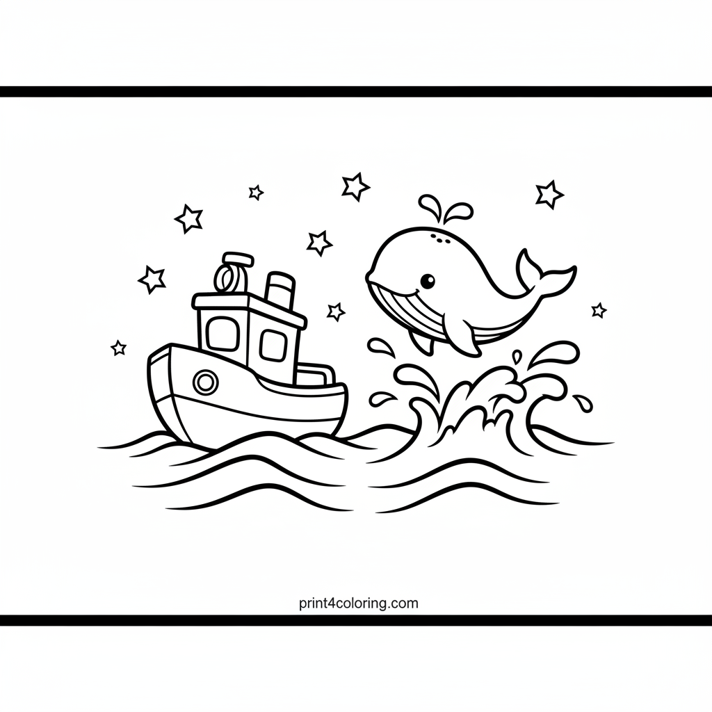Dive into a heartwarming night scene where a brave little tugboat, with its gentle light, is on a special mission! Help guide a lost baby whale back to its family under a twinkling starry sky. Color the calm ocean waves and the heroic tugboat in this sweet, nighttime adventure.