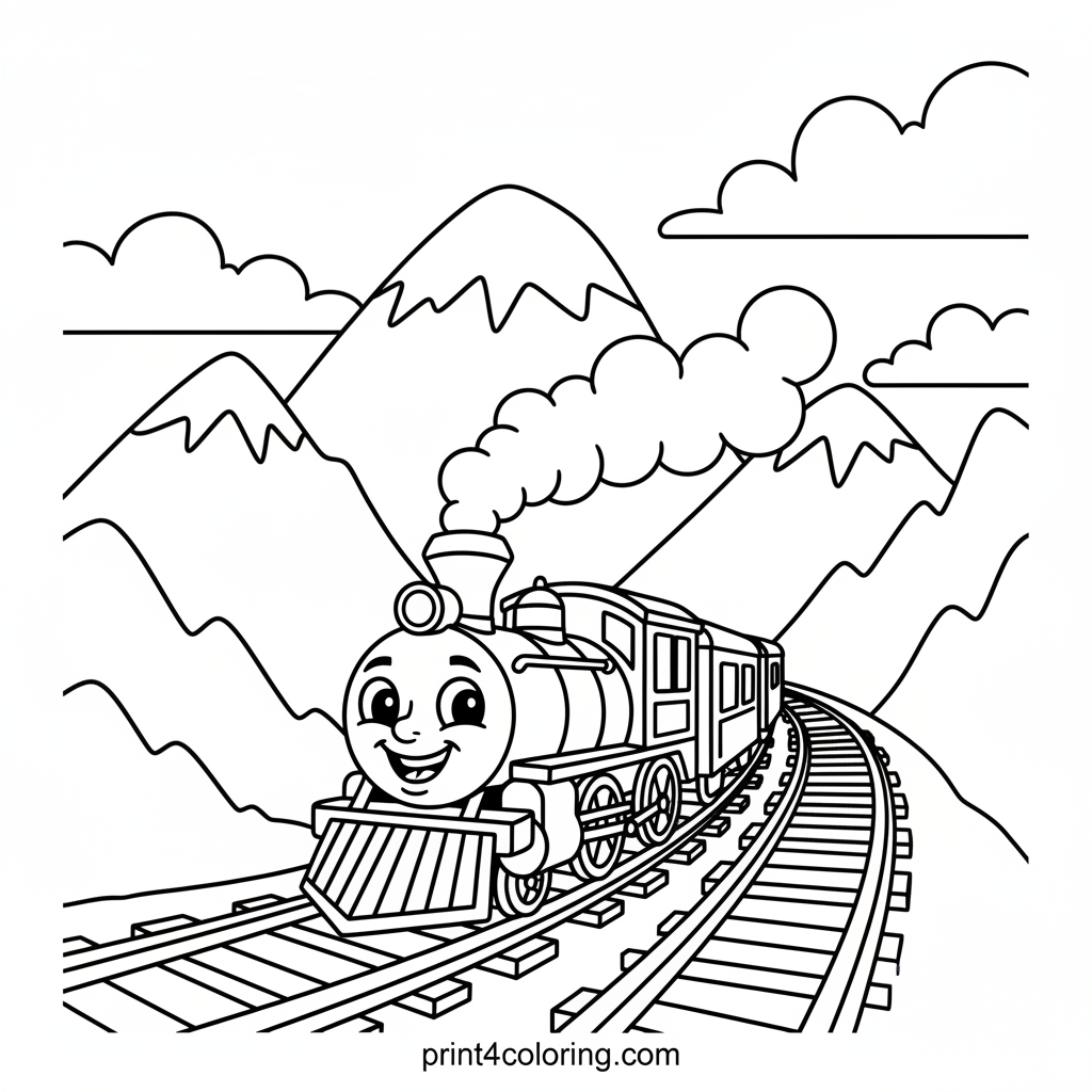 Hop aboard for an exciting journey! This coloring page features a powerful train speeding through a grand mountain pass. Imagine the wind in your hair as it chugs along tracks carved into the majestic peaks, all under a bright blue sky with soft, fluffy clouds. Get ready to add vibrant colors to this thrilling scene!