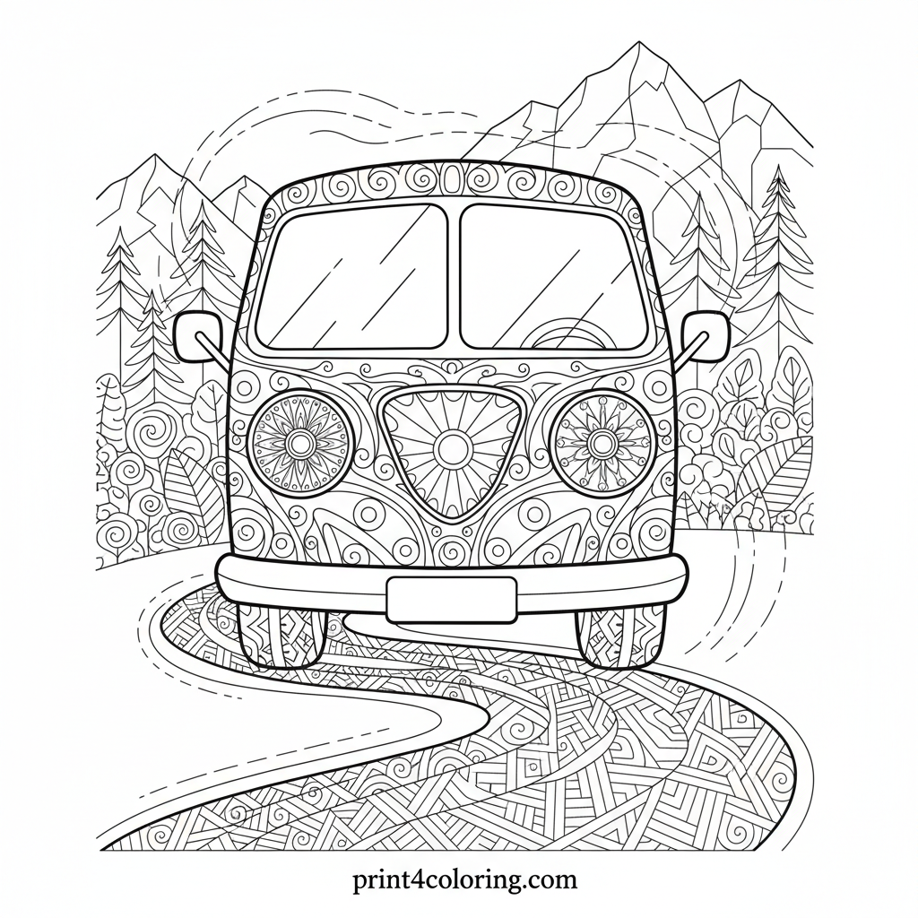 Get ready for a thrilling mountain adventure! This detailed coloring page features a sturdy camper van boldly cruising a winding mountain road. Majestic peaks with unique geological patterns rise in the background, surrounded by lush forests with intricate leaf designs. Swirling lines capture the excitement of speed, inviting you to add vibrant colors to this epic journey.