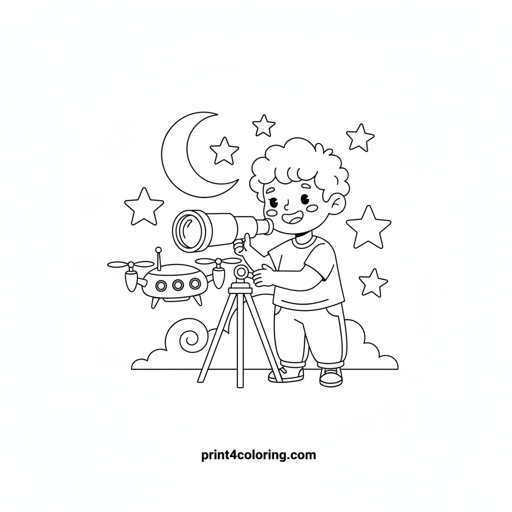 #drone#stars#moon#telescope#night-sky#space#child#astronomy#helper#adventure#coloring-page#printable