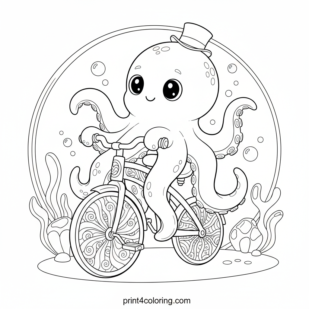 Get ready for an undersea laugh! A dapper octopus, wearing a tiny top hat, attempts a grand tricycle ballet, its eight arms comically tangled. Intricate water-themed zentangle patterns adorn the wheels, set against a bubbly, coral-like stage. This whimsical aquatic adventure promises hours of colorful fun.