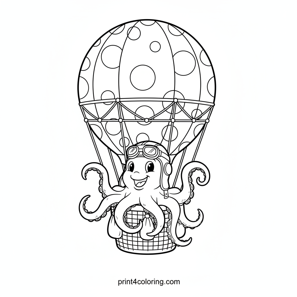 Join our friendly giant octopus on an incredible sky trip! Sporting a tiny aviator hat, this eight-armed marvel peeks from a polka-dotted hot air balloon basket, its long tentacles playfully gripping the ropes. Imagine the amazing sights it sees from up high! A whimsical scene for artists.