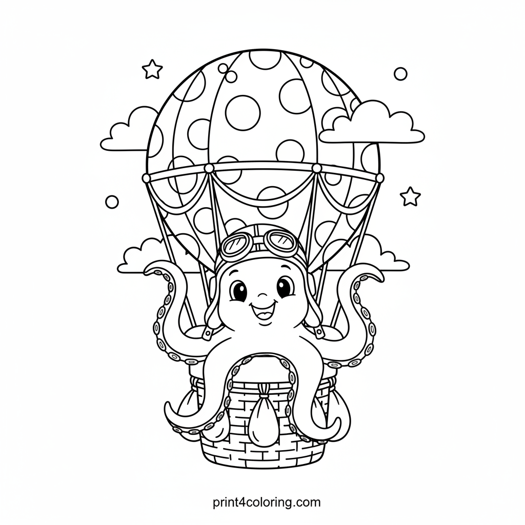 Join a giant, friendly octopus on an amazing sky journey! Sporting a tiny aviator hat, our eight-armed friend peeks from a polka-dotted hot air balloon basket, playfully gripping the ropes. Imagine the colorful world below as you bring this whimsical scene to life with your brightest crayons and markers!