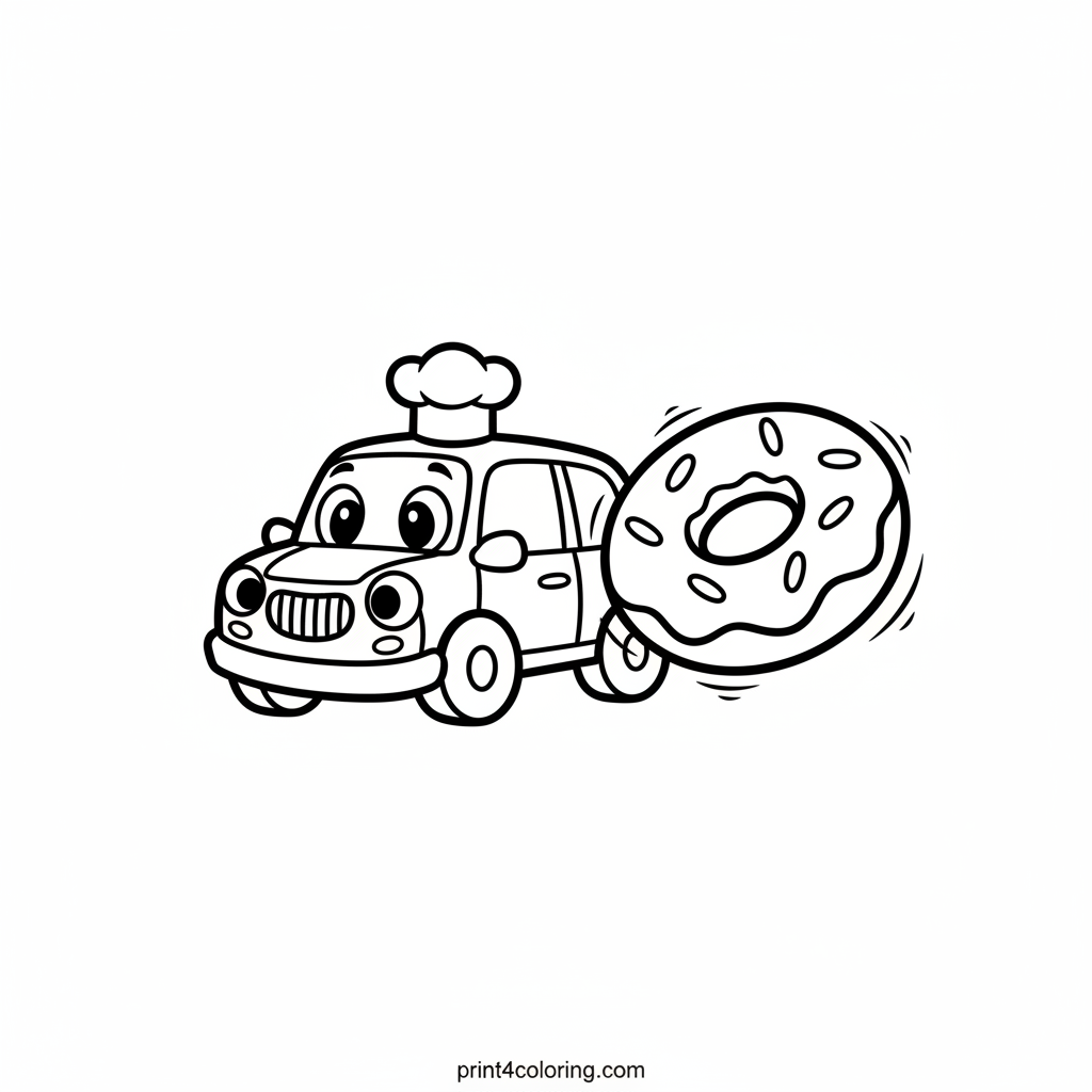 Meet Officer Friendly, the happiest police car, wearing a silly chef's hat! He's in for a big surprise as a giant, colorful donut rolls past his window. What a sweet dilemma! Grab your crayons and bring this funny scene to life with bright colors and playful sprinkles.