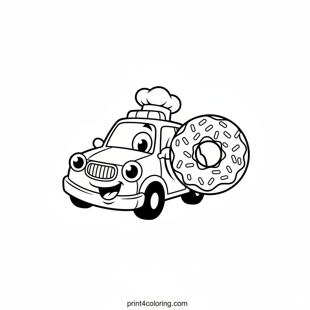Get ready for a sweet surprise! This coloring page features a cheerful police car, Officer Zoom, sporting a tiny chef's hat. Officer Zoom looks comically surprised as a massive, colorful donut rolls right past its window! What a delightful, silly dilemma for our little officer. Bring this fun scene to life with vibrant colors!