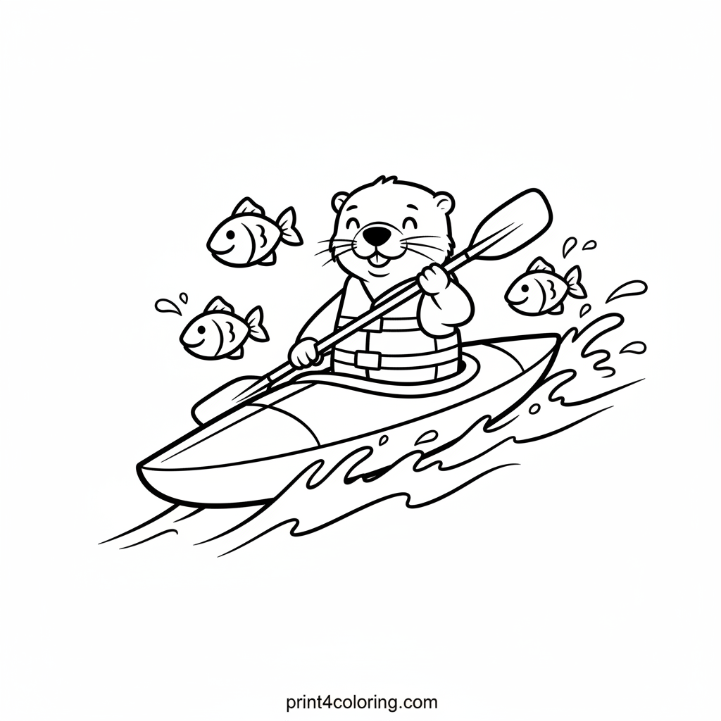 Join a cheerful otter as he paddles his sleek kayak through exciting river rapids! Watch the water splash and friendly fish leap with joy as he races by. This action-packed scene is full of movement and fun, perfect for young artists to bring to life with vibrant colors. Get ready for an aquatic adventure!