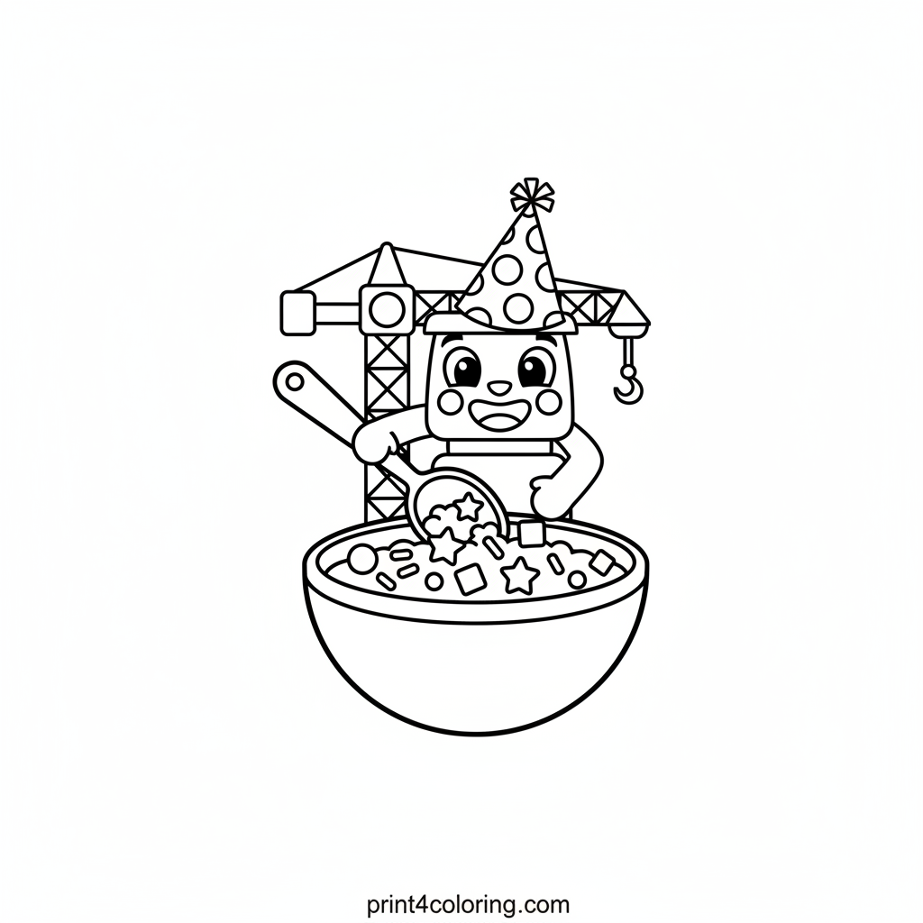 Join our cheerful Party Crane, sporting a festive hat, as it transforms its wrecking ball into a giant spoon! Watch as it happily stirs a colossal bowl overflowing with vibrant confetti and sparkling sprinkles. This delightful scene is bursting with joy and color, perfect for a sweet celebration. Get ready to add your own bright hues!