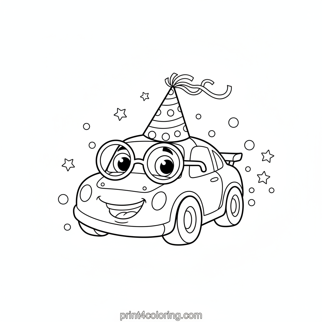Get ready for a giggle with this party-ready race car! Our speedy friend is dressed up in a hilarious oversized party hat and funny glasses, driving slowly through a shower of confetti. It's a joyful scene perfect for little artists to bring to life with their brightest colors and wildest imagination. Vroom vroom!