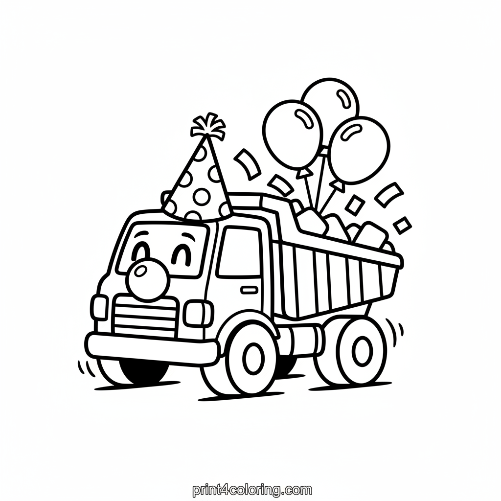 Get ready to celebrate with this super cheerful dump truck! It's wearing a silly party hat and a bright clown nose, driving with its bed overflowing with colorful balloons and sparkling confetti. This truck is ready to bring joy to any party. Grab your crayons and make this celebration scene burst with vibrant colors!