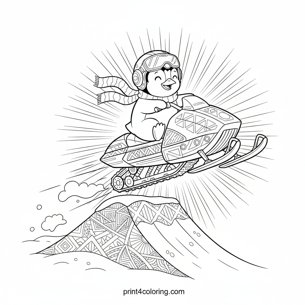 Get ready for an exhilarating ride! Our brave penguin, sporting a cool helmet and a flowing scarf, is launching an awesome snowmobile high into the air. Feel the rush of wind and the thrill of the jump, surrounded by intricate snow patterns. This dynamic scene is bursting with speed and adventure, just waiting for your vibrant colors!