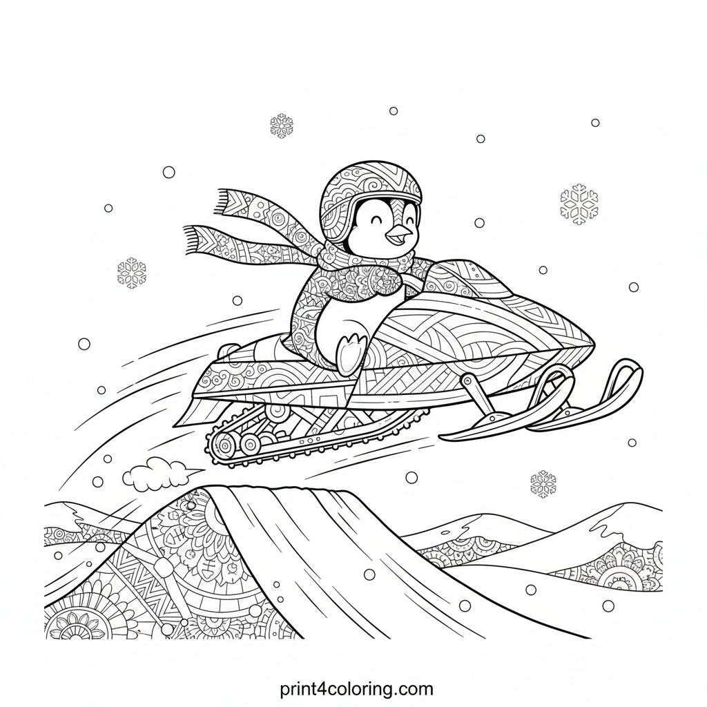Join our brave penguin hero as he launches his sleek snowmobile high into the air! Watch his long scarf flow and feel the thrill of speed as he leaps from the snow ramp. Intricate geometric snow patterns below add to the dynamic scene, making this a challenging and exciting page to color for all ages. Get ready for an epic winter adventure!