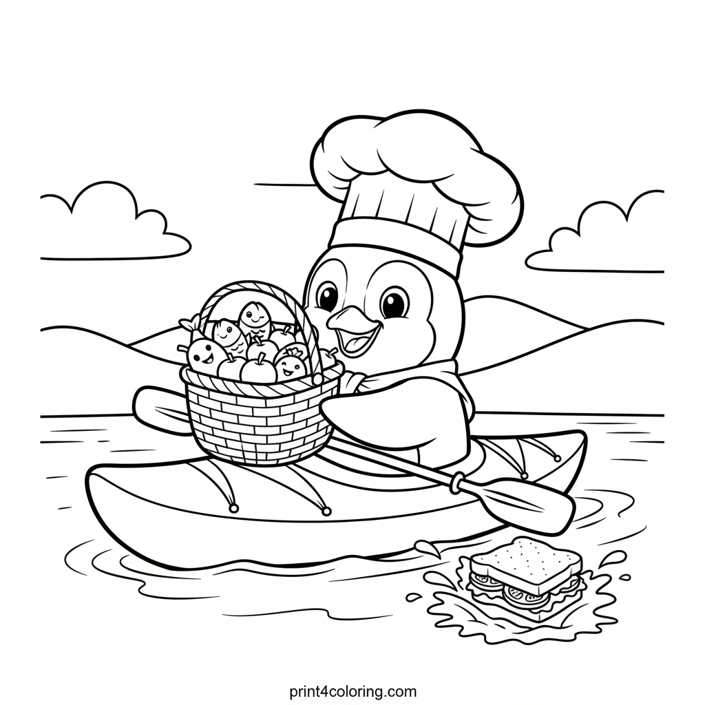 A clumsy but happy penguin, wearing a chef's hat, is on a fun kayak adventure! He's trying to balance a picnic basket full of fish, but oops, a sandwich just made a funny splash. Bring this silly, watery scene to life with your favorite colors!