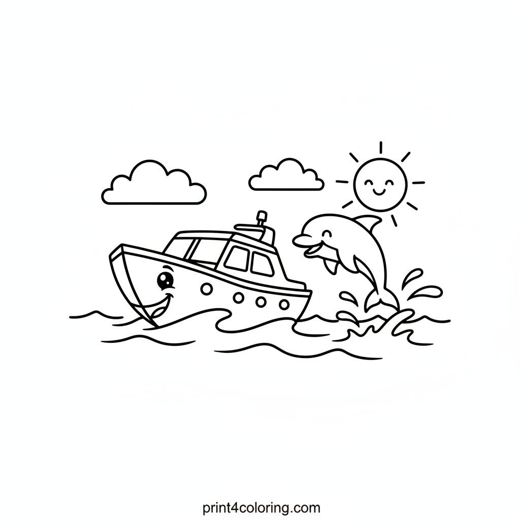 Dive into a delightful ocean scene! A cute, speedy yacht zips across the water, accompanied by a joyful dolphin leaping playfully alongside it. Imagine the splashes and the gentle wake as you bring this friendly race to life with your favorite colors. A perfect page for young adventurers!
