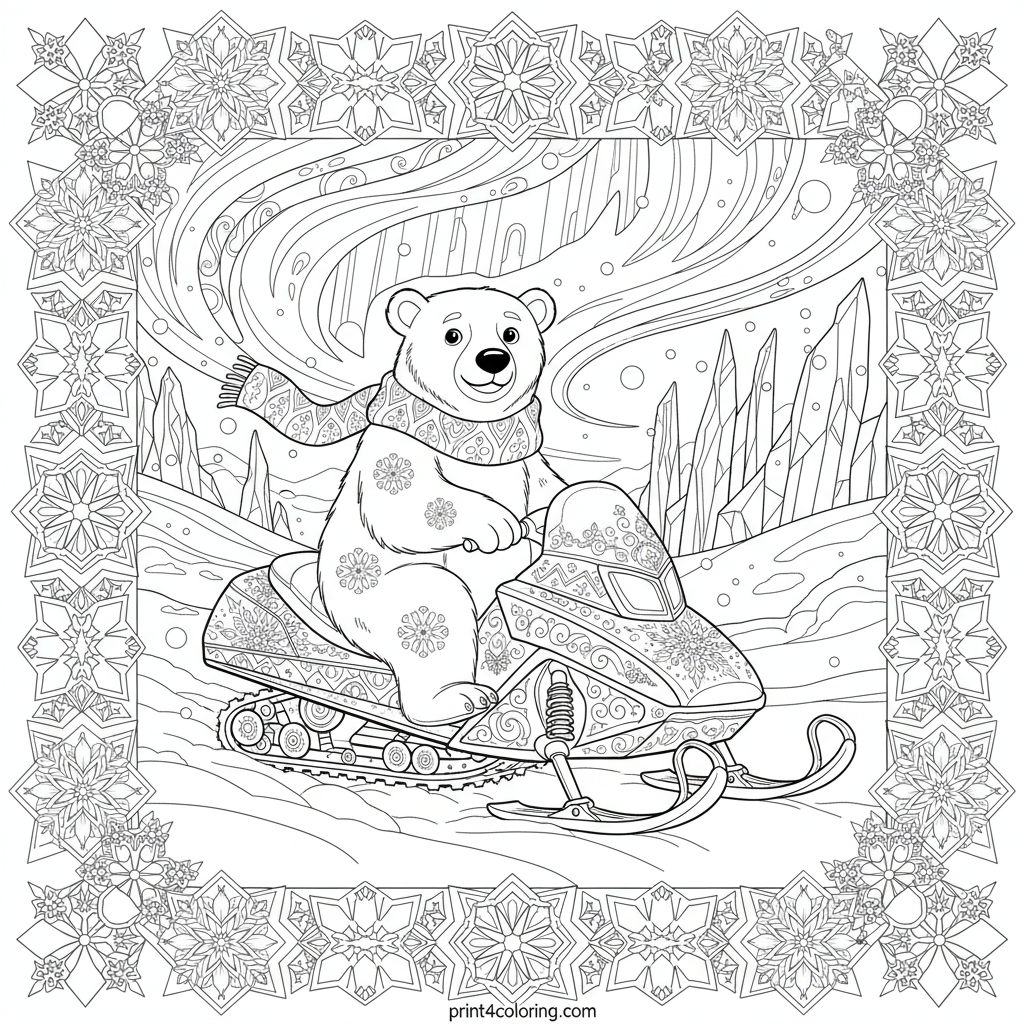 #polar-bear#arctic#snowmobile#aurora-borealis#northern-lights#fantasy#winter#patterns#ice-crystals#magical#adventure#coloring-page#printable